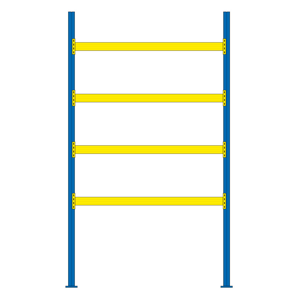 Praktisches Großfachregal für Paletten, Gitterboxen und Behälter. Mit diesem Regalsystem steht Ihnen ein leistungsstarkes und praxisbewährtes Produkt zur Auswahl. Die Stützenprofile sind aus hochfestem Stahl geformt und erhalten durch ihre spezielle Profilierung eine sehr hohe Steifigkeit. Sie werden durch Diagonal- und Horizontalstreben zu einem Fachwerkrahmen verschraubt. Die Anlieferung bei Ihnen erfolgt zerlegt. Die steckbaren Tragbalken gewährleisten eine einfache und schnelle Montage und kurze Umbauzeiten. Sie sind auch nachträglich im Raster von 50 mm in der Höhe verstellbar. Das praxisgerechte Zubehör ermöglicht den betrieblichen Erfordernissen leicht anpassbare Lösungen. Dieses Regalsystem ist mit allen Stapelgeräten bedienbar. Regalstützen blau RAL 5010, Fachwerk verzinkt, Tragbalken goldgelb RAL 1004 kunststoffbeschichtet.