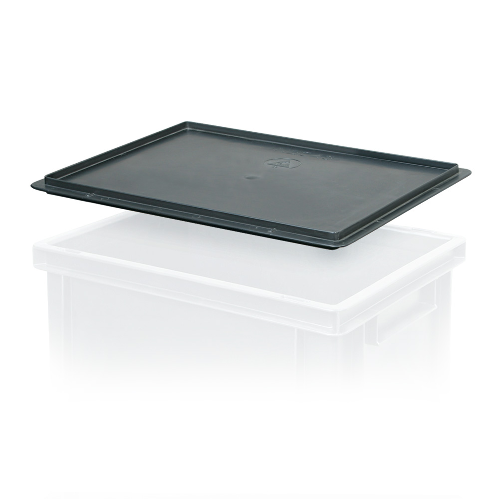 Auflagedeckel für Euro-Stapelbehälter, LxB 400x300 mm. Farbe schwarz. Elektrisch leitfähig. Material PP.