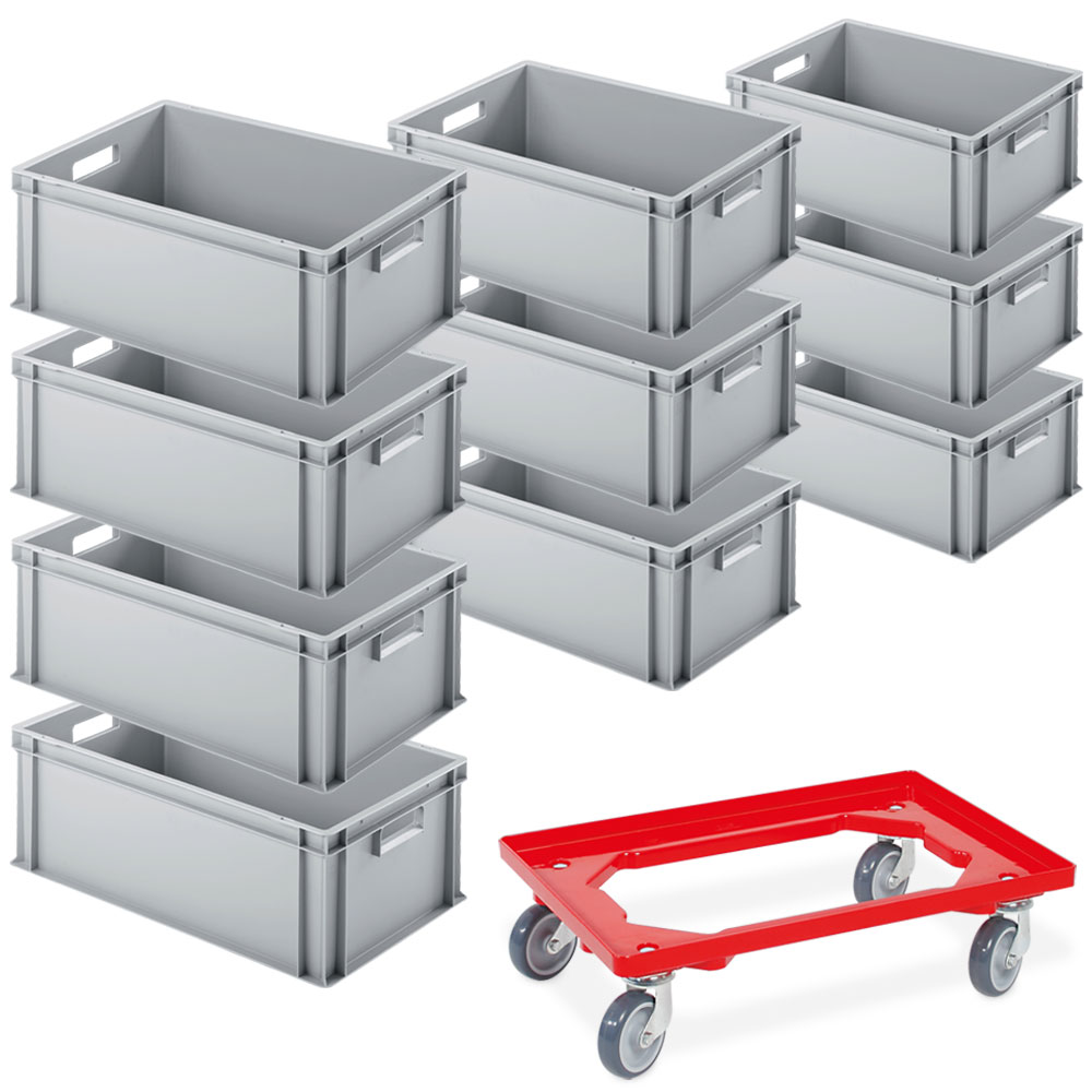 Set mit 10 Euro-Stapelbehältern, LxBxH 600x400x220 mm + 1 GRATIS Transportroller