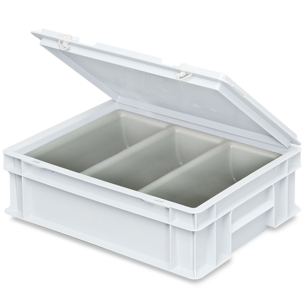 Besteckkasten zum ordentlichen sortieren, lagern und transportieren von Besteck. Die Transportbox für Besteck ist mit einem grauen Besteckeinsatz (3 Mulden), Scharnierdeckel und 2 Schiebeverschlüssen ausgestattet, ist spülmaschinenfest und besteht aus hygienisch einwandfreiem Polypropylen-Kunststoff (PP). Der Deckel kann mittels der Schiebeverschlüsse fest verschlossen werden und schütz Ihr Besteck vor Staub und Verunreinigungen. 2 Griffleisten ermöglichen ein einfaches und leichtes Handling.