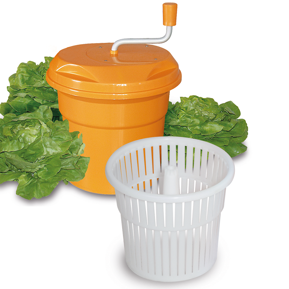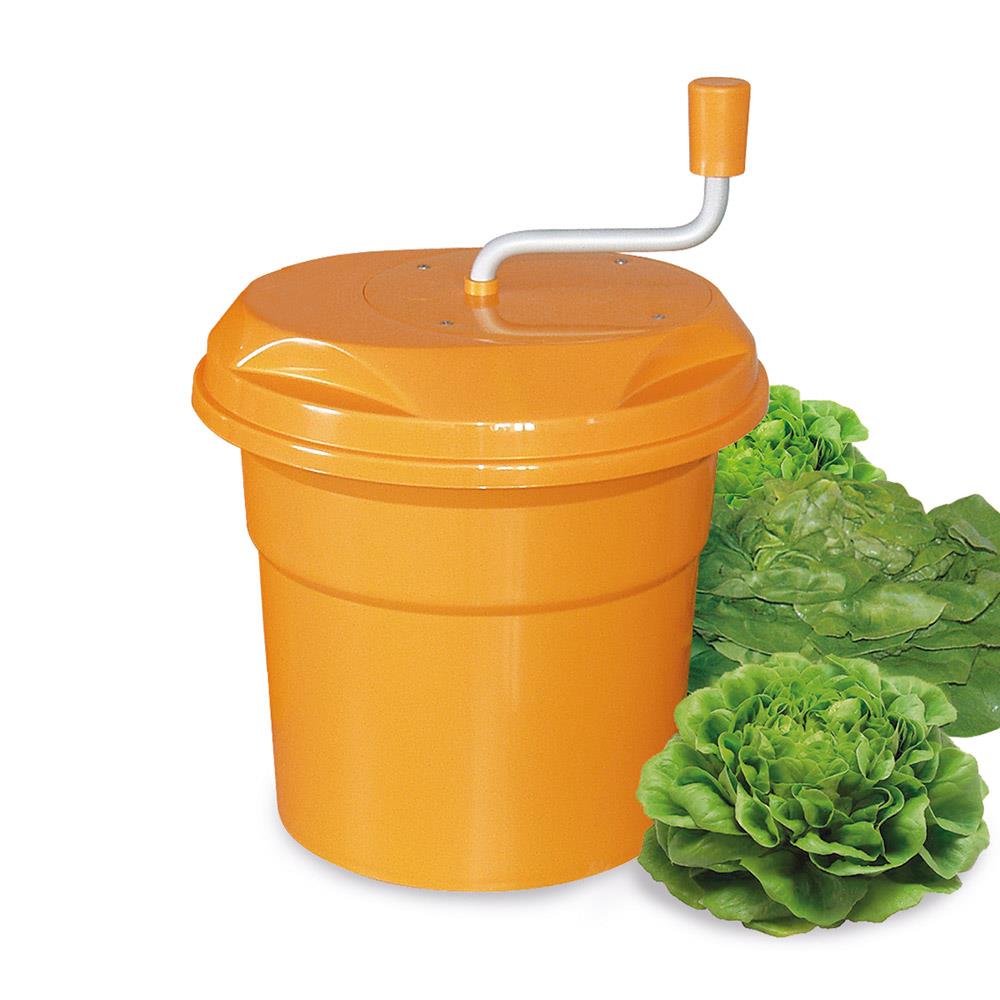 Salatschleuder für extra trockenen Salat. Behälter aus Polypropylen-Kunststoff (PP) mit eingesetztem Abtropfkorb und stabilem Antrieb. Mühelos und leicht drehbar. ØxH 330x430 mm. Inhalt 12 Liter. Für 3-4 Salatköpfe oder max. 2,8 kg. Farbe orange.