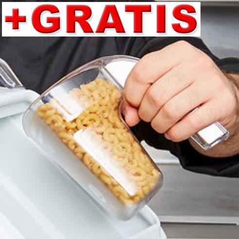 Praktischer Zutatenbehälter für Schüttgüter aller Art. Sicheres Aufbewahren der Schaufel an einem Haken im Zutatenbehälter, ohne das der Griff mit den Lebensmitteln in Berührung kommt. Stapelbar - die Zutaten bleiben leicht zugänglich. Glatte Flächen erleichtern die Reinigung. Die Trennwand sorgt für ein sicheres Dosieren der Zutaten. Mit großen Griffen zum Tragen. Gratis dazu erhalten Sie eine Portionierschaufel.