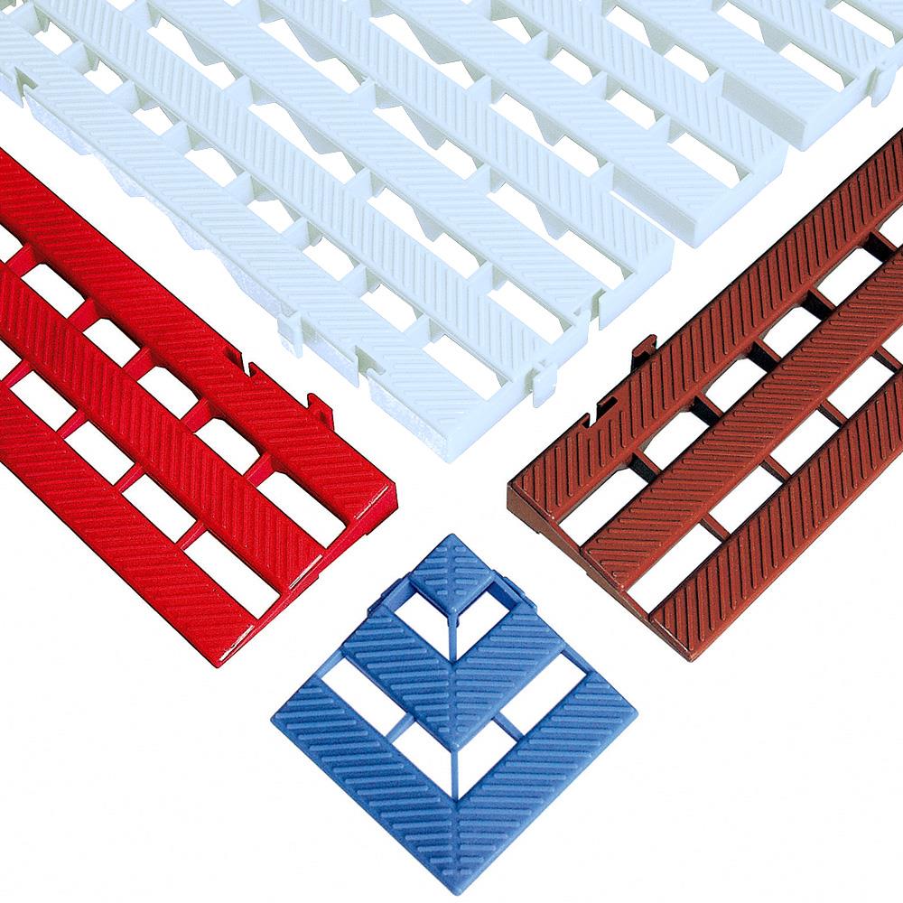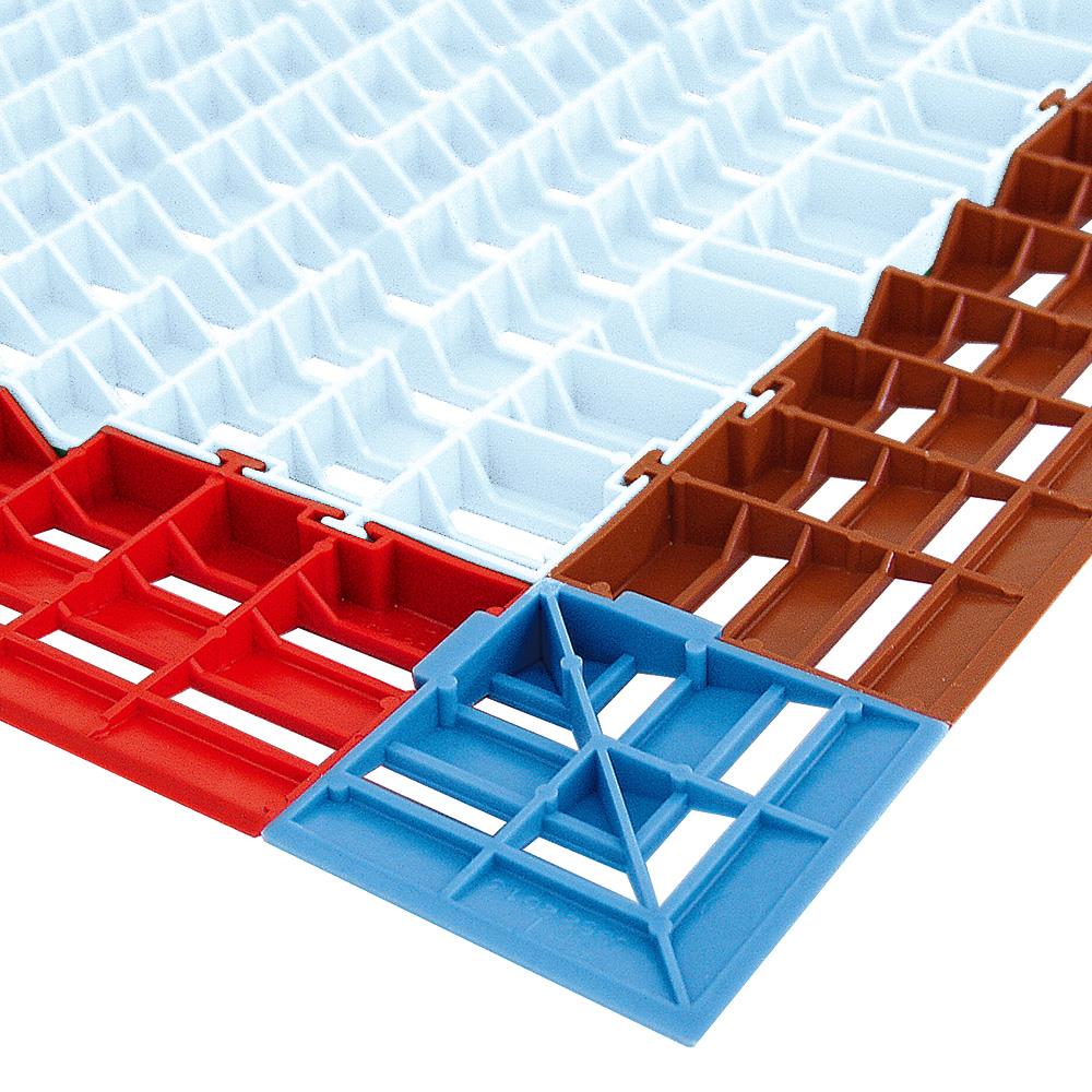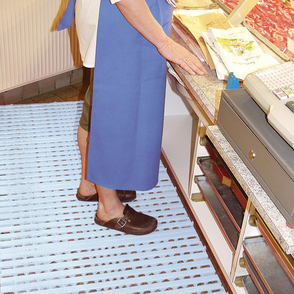 Die Kunststoff-Bodenroste sind bestens geeignet für Feuchträume, hinter Theken, in Kühlhäusern, Umkleideräumen, vor Maschinen und Werkbänken. Anti-Rutsch-Noppen auf der Oberfläche mindern das Risiko für Rutschunfälle. Die pflegeleichten und unverwüstlichen Nassraummatten sind aus hochwertigem Polyethylen-Kunststoff (PE-HD) hergestellt. Die Elemente werden durch einfaches Ineinanderstecken verbunden und lassen sich bei Bedarf wieder lösen. Die Kunststoff-Bodenmatten können beliebig zugeschnitten werden und sind leicht zu reinigen, auch in Spülmaschinen und mit dem Dampfstrahler. Die im Spritzverfahren hergestellten Kunststoffroste sind weitgehend chemikalienbeständig und können problemlos mit Transportrollern, Wagen und Hubwagen befahren werden.