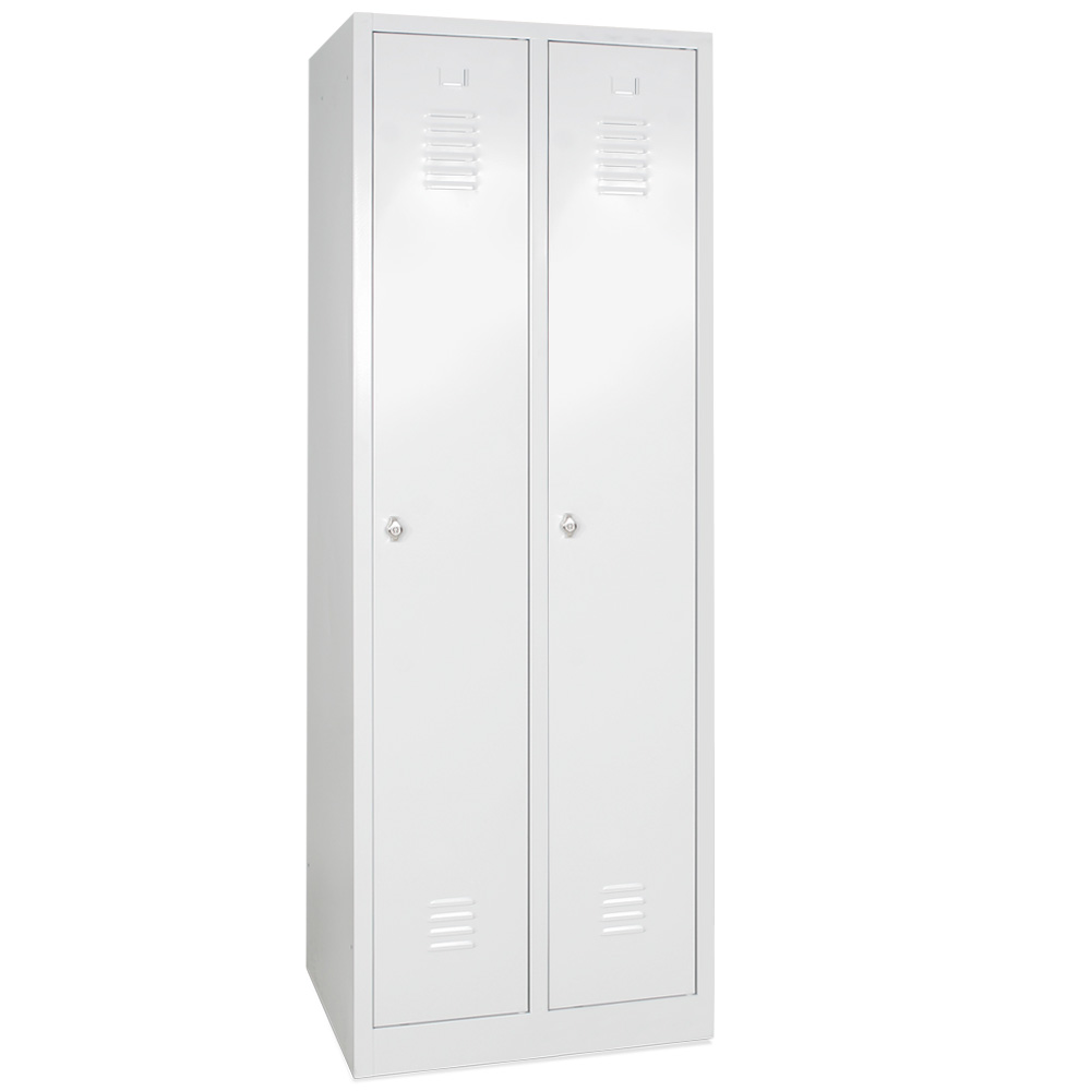 Stabiler, geschweißter Stahlblechspind, leicht und hygienisch zu reinigen. Hochwertig kunststoffbeschichtet in Farbe lichtgrau RAL 7035. Aus gekantetem und fest verschweißtem Stahlblech. Türen mit integrierter Verstärkung, innenliegenden Scharnieren, Lüftungsschlitzen und Drehriegelverschluss für Vorhängeschlösser. Je Abteil mit Hutboden, Kleiderstange und 2 Schiebehaken. Optional mit Schrägdachaufsatz, Sitzbankuntergestell und unterschraubbaren Schrankfüßen.