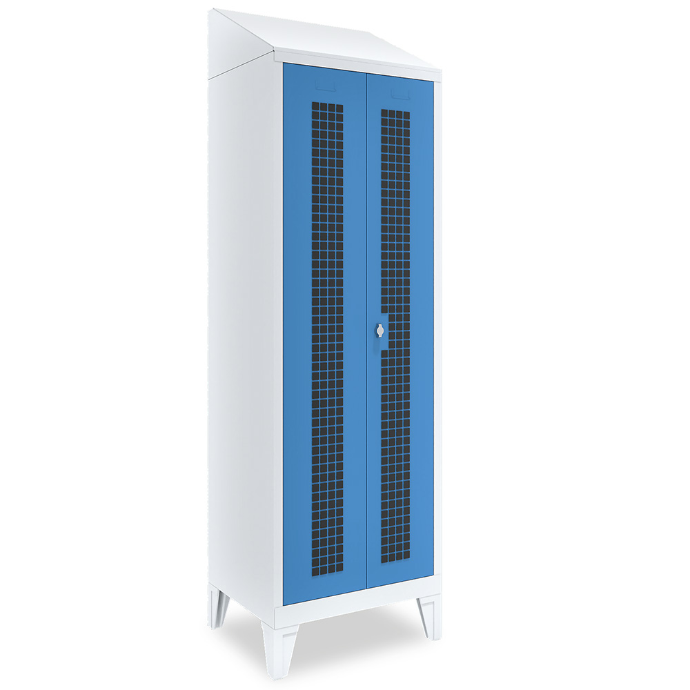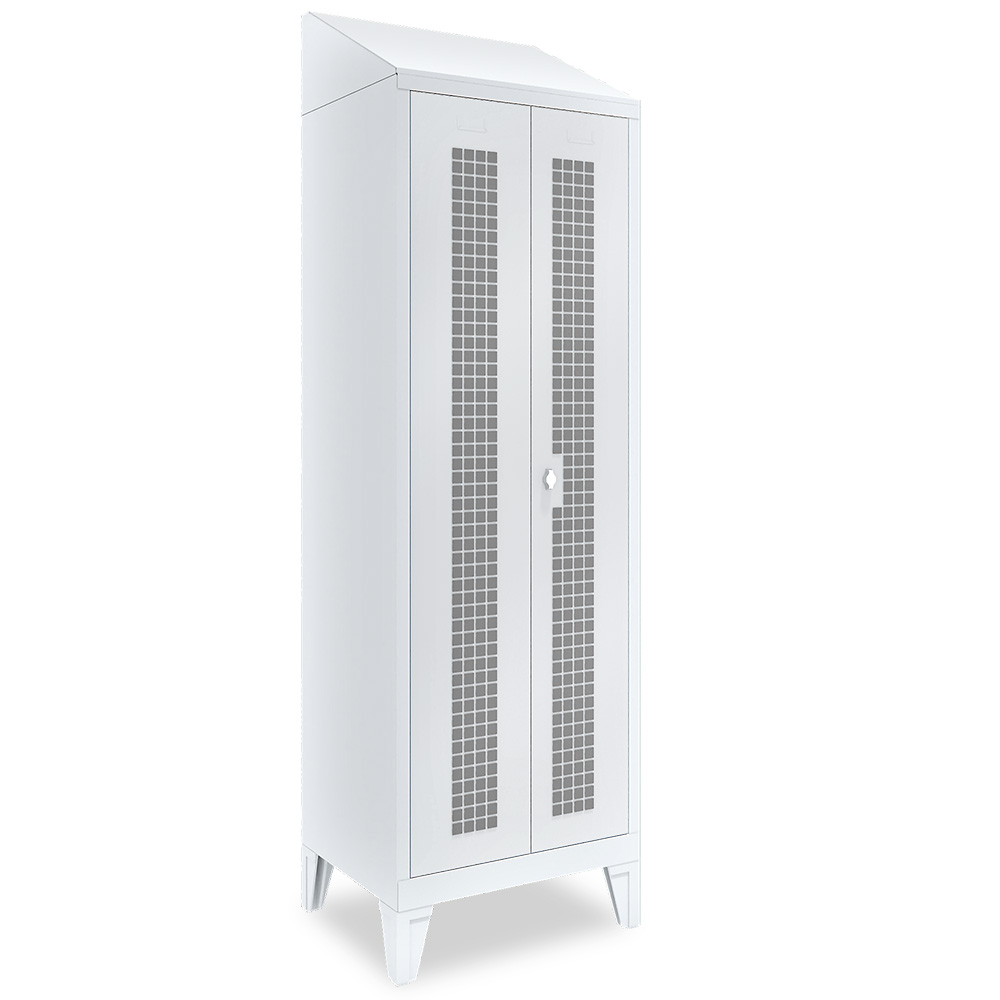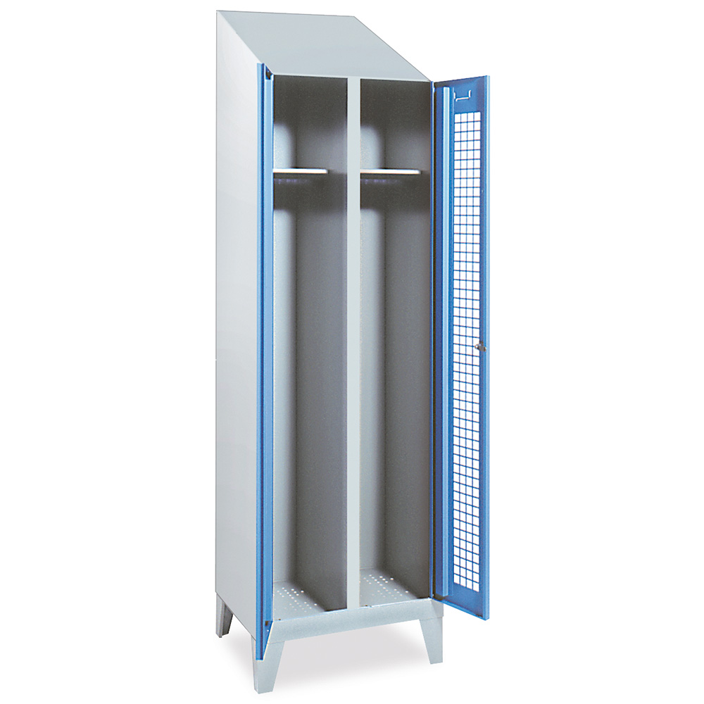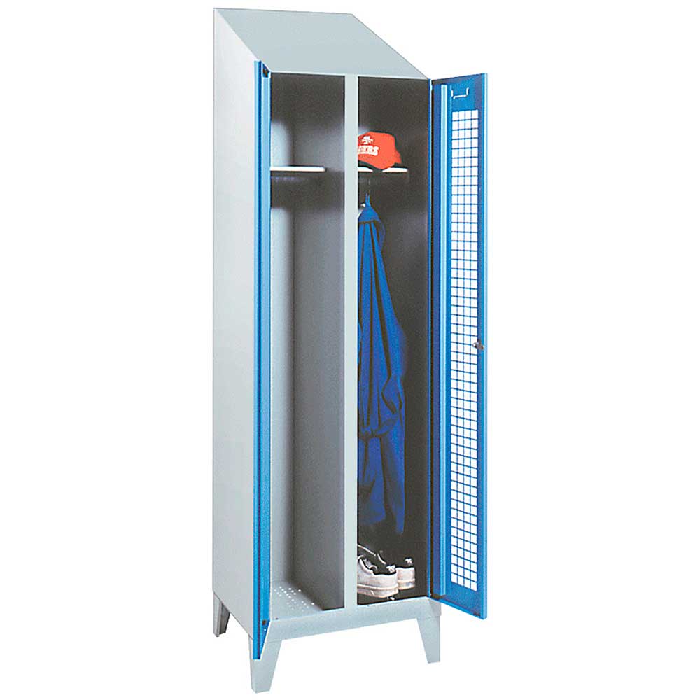 Doppelabteilspind nach EU-Richtlinie. Spezialschrank für Lebensmittelbetriebe. Extra hohes Schrägdach, Schrank ist hinten 200 mm höher. Schrägdachausführung mit Höhe 100 mm ist auf Anfrage lieferbar. Gelochte Türen und Bodenlochung. Der Schrank wird aufstellfertig angeliefert.