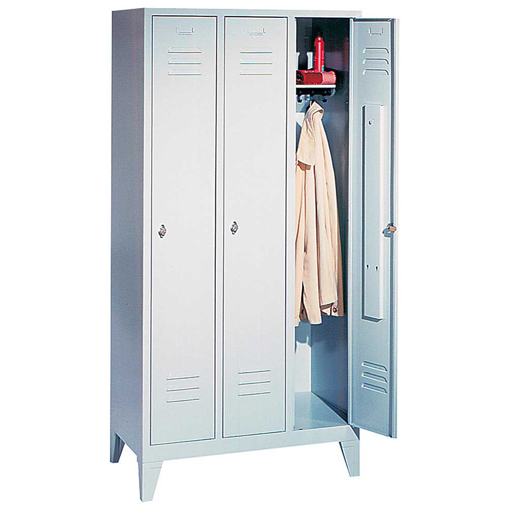 Solide geschweißte Stahlblechkonstruktion. Leichte Reinigung durch randlose Flächen an Boden und Hutablage. Alle Türen sind rechts angeschlagen, in Drehbolzen gelagert und innen zusätzlich verstärkt. Glatte Oberflächen, sauber verarbeitet und in Farbe lichtgrau RAL 7035 hochwertig einbrennlackiert. Der Schrank wird aufstellfertig angeliefert. Alle Abteile sind mit praktischem Zubehör wie Hutboden, Kleiderstange mit 3 Schiebehaken, Handtuchhalter, Lüftungsschlitzen, und Namensschildrahmen ausgestattet. Kleiderschrank mit 4 Kunststoff-Füßen. Die Kunststoff-Füße haben eine hohe Beständigkeit gegen Reinigungsmittel, sie können nicht rosten.