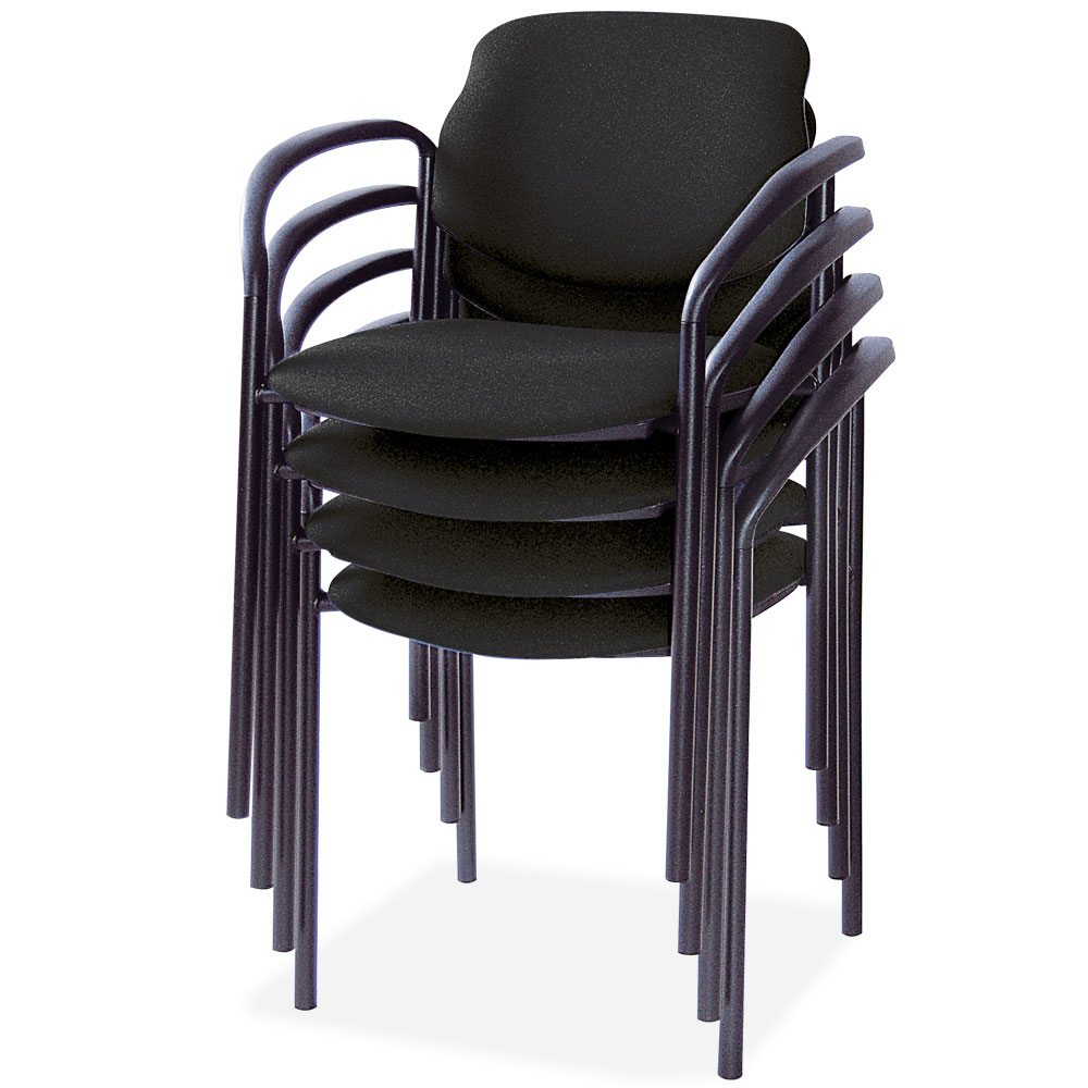 Komfortable und robuste Stühle mit gepolstertem Sitz- und Rückenteil, körpergerecht geformt. Sitz und Rücken mit hinterer Kunststoffabdeckung. Armlehnen aus geformtem Kunststoff. Rundrohrgestell kunststoffbeschichtet in Farbe schwarz. Die Stoffe sind feuerhemmend gemäß Brandschutzklasse EN 1021-1.