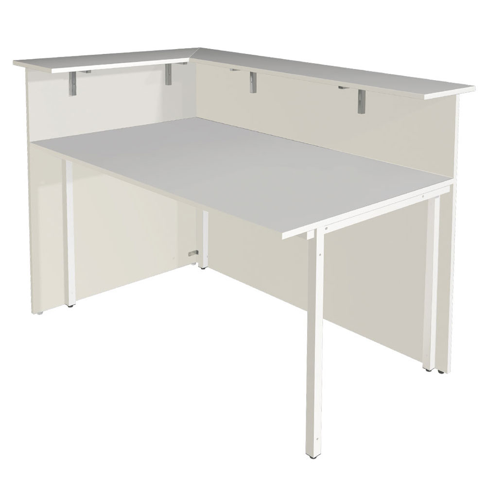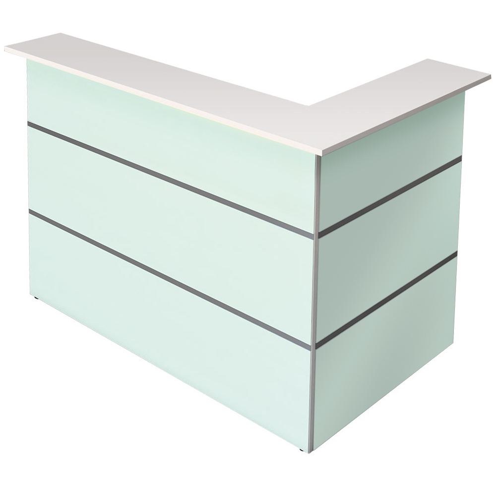 Bei dieser Ecktheke handelt es sich um eine Stahlkonstruktion, die mit hochverdichteten E1 Gütespanplatten verblendet wird. Der Thekenkörper ist mit dekorativen Glasplatten und Edelstahlstreifen bestückt. Hinter der 1100 mm hohen Front befindet sich ein vollwertiger Arbeitsplatz mit einer Tiefe von 800 mm und einer Höhe von 750 mm. Die Gütespanplatten sind hochwertig melaminharzbeschichtet und mit umlaufenden, abgerundeten 2 mm starkem Kantenschutzprofil aus ABS versehen. Des Weiteren ist die Arbeitsplatte mit einem Kabeldurchlass versehen. Aus Stabilitätsgründen müssen immer am Anfang und Ende einer Thekenanlage Seitenblenden angebracht werden. Bei der Ecktheke ist nur eine Seitenblende erforderlich, weil sich auf der anderen Seite bereits eine hohe Seiteblende befindet. Umfangreiches Zubehör wie LED-Leuchtleiste, Taschenablage, Rollcontainer, Seitenblenden usw. ermöglichen die sinnvolle Abrundung zu einem freundlichen Arbeitsplatz.