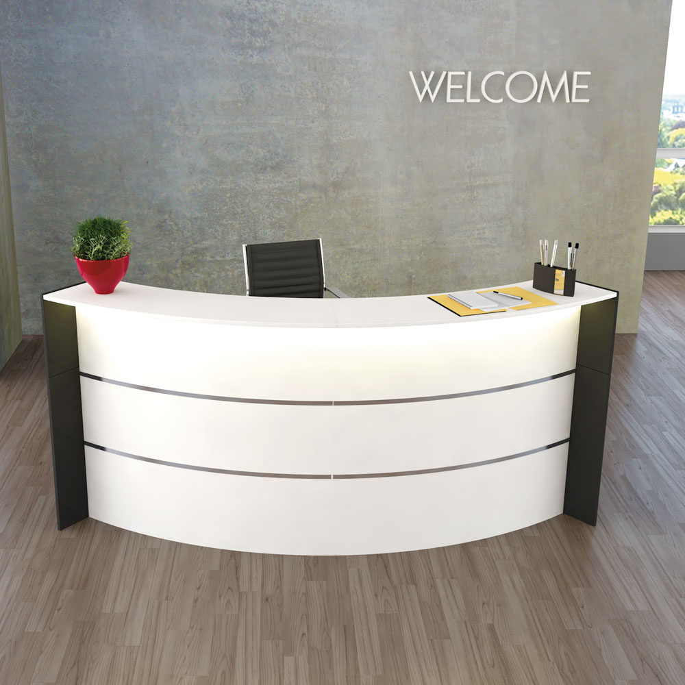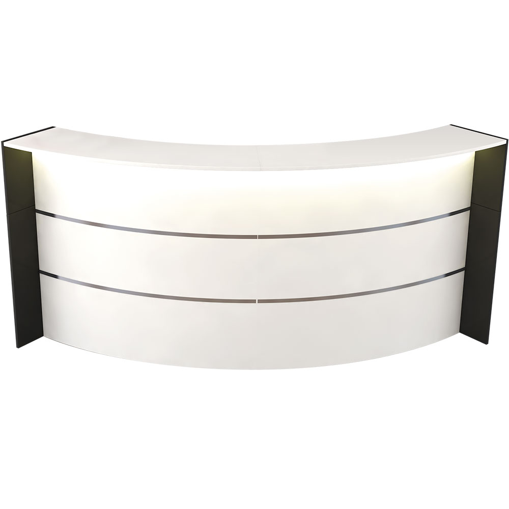 Diese Bogentheke ist eine solide Holz-/Stahlkonstruktion in modularer Bauweise. Die E1 Gütespanplatten sind mit Melaminharz beschichtet und mit 2 mm starken, stoßfesten ABS-Kanten versehen. Die Arbeitsplatte der Theke hat eine Tiefe von 800 mm. Für die Kabelführung gibt es 2 Durchlässe in der Arbeitsplatte. Die Thekenfront ist mit dekorativen Edelstahlstreifen bestückt. Für die Fronten stehen 2 Dekore zur Verfügung: weiß/Glas und Anthrazit. Die Bogentheke kann optional mit einem Stauraum-Element ausgestattet werden. Der großzügige Stauraum (B 30 × H 73,5 × T 60 cm) besitzt einen verstellbaren Fachboden und bietet Platz für den PC, Ordner und Unterlagen. Des Weiteren gibt es für diesen Stauraum eine verschließbare Tür. Die Bogentheke kann optional mit einer LED-Beleuchtung versehen werden.