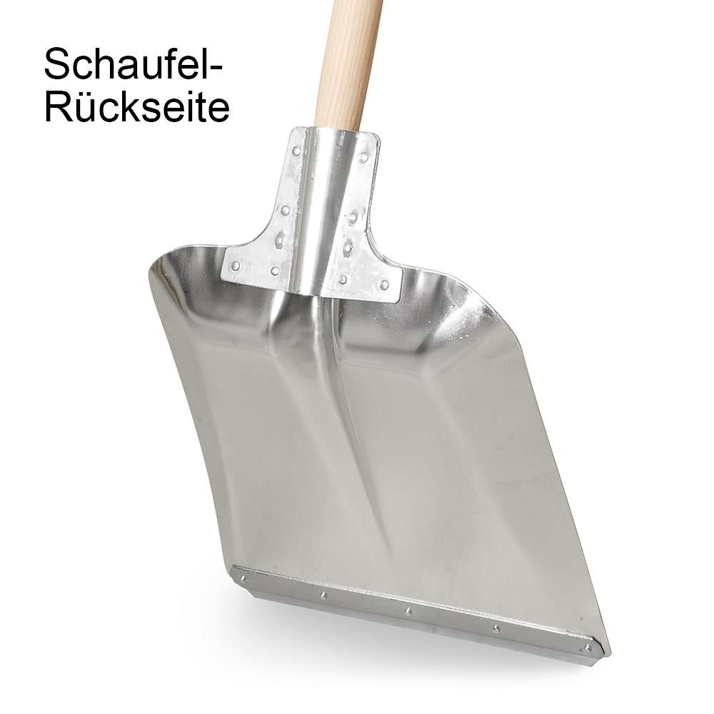1-A Eschenholzstiel, fein geschliffen, für die perfekte Handhabung, Länge 1300 mm, Ø 31 mm. Schaufelmaße LxB 460x380 mm, Stielhalter Ø 36 mm, Materialstärke 2,5 mm.