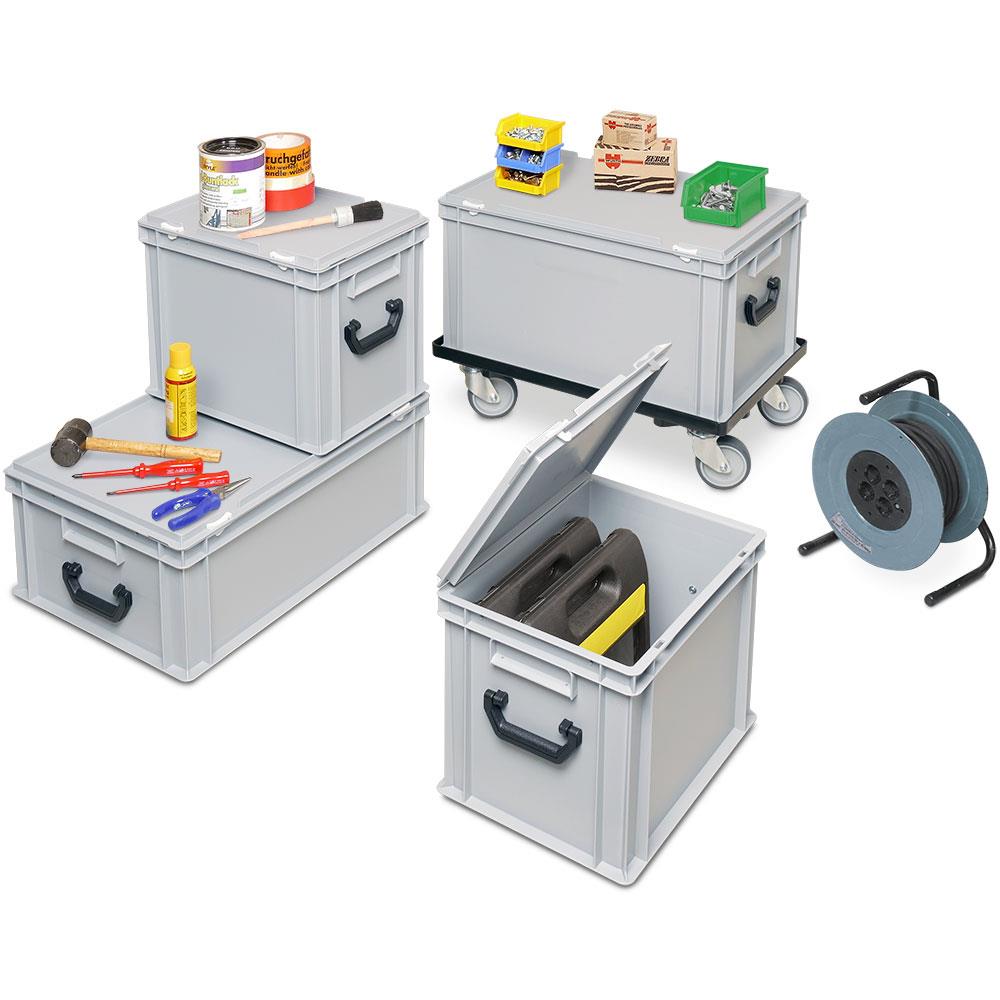 Die Werkstattkoffer haben 3 unterschiedliche Größen, sind einzeln tragbar und lassen sich problemlos aufeinanderstapeln. Der große Koffer bietet mit einem Volumen von 65l Platz für große Geräte wie Handkreissäge oder Bohrmaschine. Die kleineren Werkstattkisten bieten mit einem Volumen von 30l und 45l ebenfalls ausreichend Platz für Akkuschrauber, Zollstock, Zangen und Co.