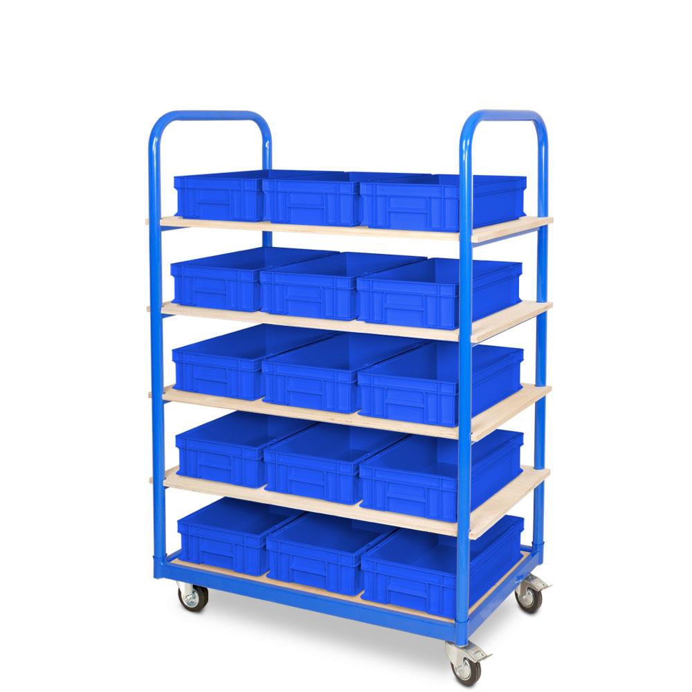 Etagenwagen mit 5 Ebenen, BxTxH 1050x500x1450 mm, 2 Lenk- (mit Feststellbremse) u. 2 Bockrollen, bestückt mit 15 Euroboxen, BxTxH 400x300x120 mm, mit Griffleisten