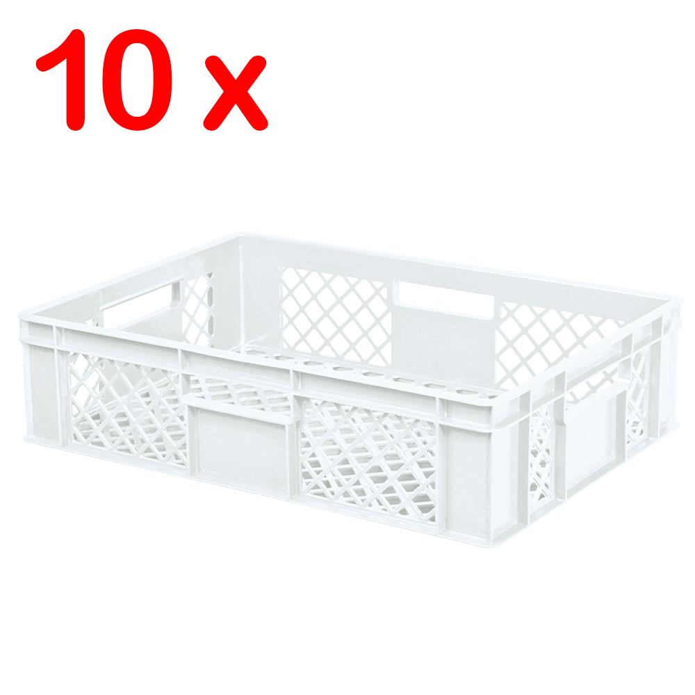 Das fahrbare Regal ist mit 10 robusten Euro-Stapelkästen, Ausführung durchbrochen, im Format 600x400x150 mm bestückt. Diese Stapelbehälter überzeugen durch erstklassige Qualität. Die Behälter sind leicht, reinigungsfreundlich, extrem stabil und langlebig, spülmaschinenfest und gegen die meisten Chemikalien beständig. Kältebeständig bis -40°C, hitzebeständig bis +60°C.