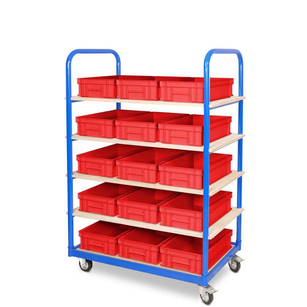 Etagenwagen mit 5 Ebenen, BxTxH 1050x500x1450 mm, 2 Lenk- (mit Feststellbremse) u. 2 Bockrollen, bestückt mit 15 Euroboxen BxTxH 400x300x120 mm, mit Griffleisten
