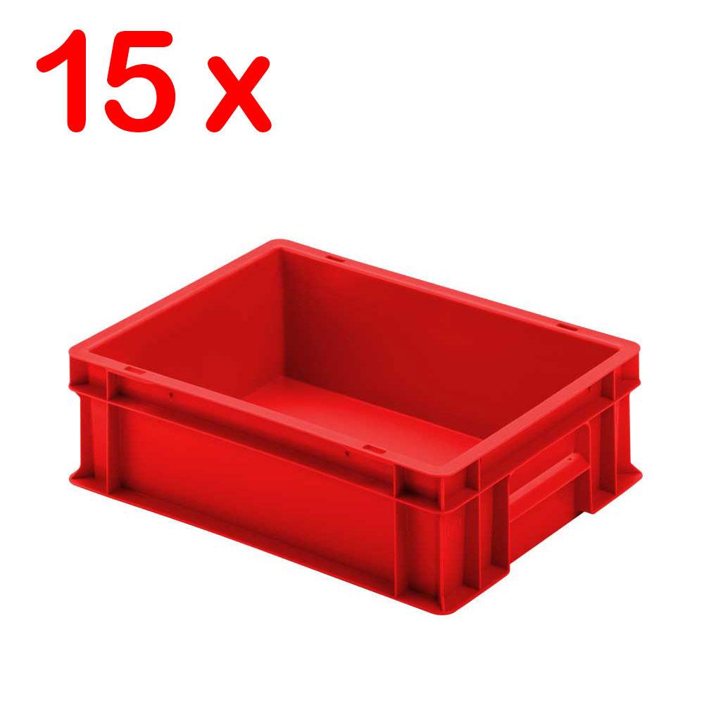 Das fahrbare Regal ist mit 15 robusten Euro-Stapelboxen im Format 400x300x120 mm bestückt. Diese Eurobehälter überzeugen durch erstklassige Qualität. Die Kunststoffboxen sind die idealen Lager- und Transportbehälter für Industrie und Handwerk. Glatte Innenwände ermöglichen eine leichte und hygienische Reinigung der Boxen. Die Behälter sind extrem stabil und langlebig, spülmaschinenfest und gegen die meisten Chemikalien beständig. Kältebeständig bis -20°C, hitzebeständig bis +80°C.