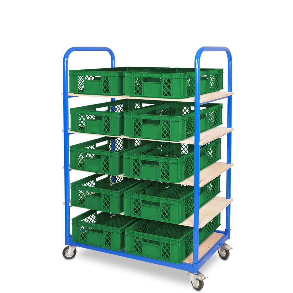 Etagenwagen mit 5 Ebenen, BxTxH 1050x500x1450 mm, 4 Lenkrollen, 2 Rollen mit Feststellbremse, bestückt mit 10 Euroboxen BxTxH 600x400x150 mm, durchbrochen, mit Durchfassgriffen
