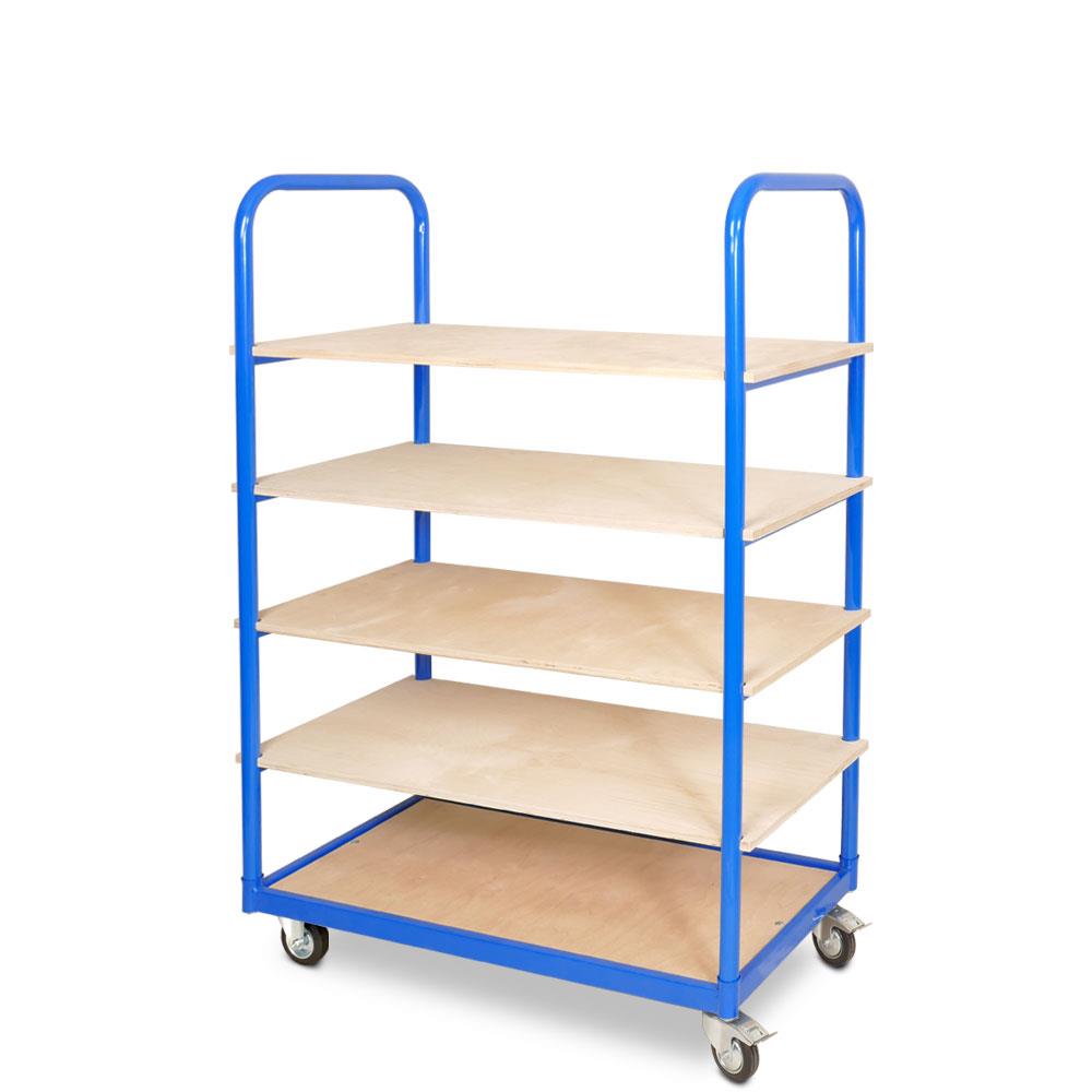 Der Kommissionierwagen verfügt über 5 Ebenen mit robusten, 15 mm starken und naturbelassenen Schichtholzladeflächen. Die geschweißte Stahlrohr- und Profilstahlkonstruktion ist hochwertig in der Farbe blau RAL 5010 kunststoffbeschichtet und schützt dadurch die Oberflächen vor den alltäglichen Belastungen des Betriebsalltags. Der Kommissionier- und Transportwagen hat 2 Lenkrollen und 2 Bockrollen mit leise laufenden Gummiräder, die eine einfache und sichere Handhabung ermöglichen. 2 Feststellbremsen gewährleisten auch im beladenen Zustand und Bodenneigungen einen sicheren Stand.
