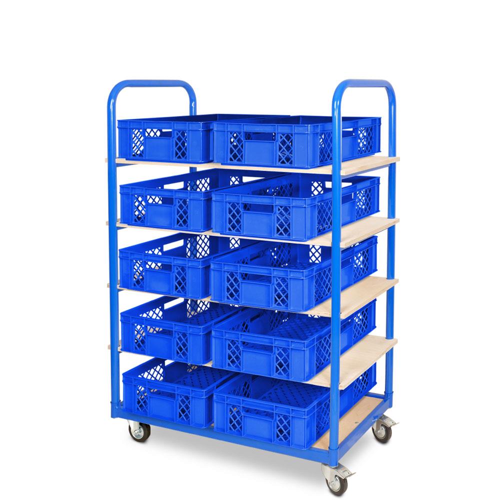 Etagenwagen mit 5 Ebenen, BxTxH 1050x500x1450 mm, 2 Lenk- (mit Feststellbremse) u. 2 Bockrollen, bestückt mit 10 Euroboxen BxTxH 600x400x150 mm, durchbrochen, mit Durchfassgriffen