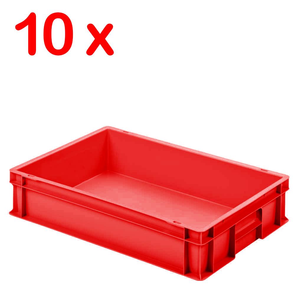 Das fahrbare Regal ist mit 10 robusten Euro-Stapelboxen im Format 600x400x120 mm bestückt. Diese Eurobehälter überzeugen durch erstklassige Qualität. Die Kunststoffboxen sind die idealen Lager- und Transportbehälter für Industrie und Handwerk. Glatte Innenwände ermöglichen eine leichte und hygienische Reinigung der Boxen. Die Behälter sind extrem stabil und langlebig, spülmaschinenfest und gegen die meisten Chemikalien beständig. Kältebeständig bis -20°C, hitzebeständig bis +80°C.