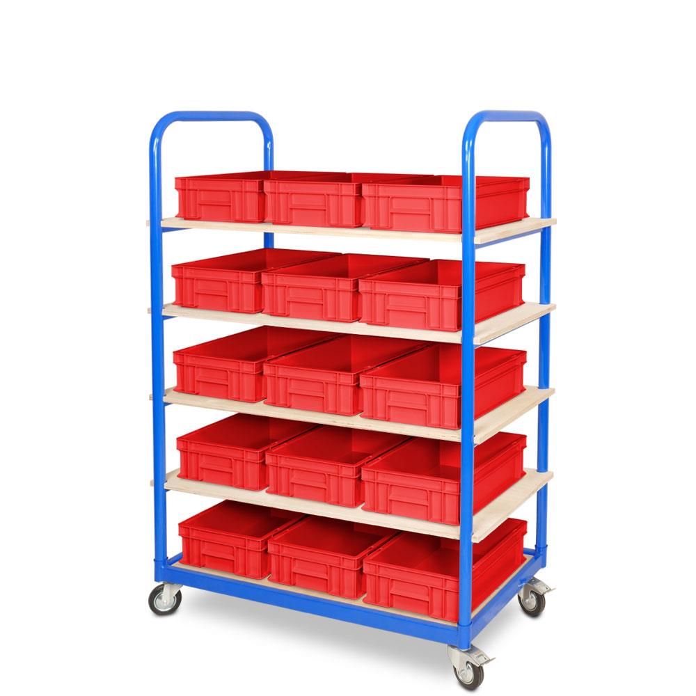 Etagenwagen mit 5 Ebenen, BxTxH 1050x500x1450 mm, 4 Lenkrollen, 2 Rollen mit Feststellbremse, bestückt mit 15 Euroboxen BxTxH 400x300x120 mm, mit Griffleisten