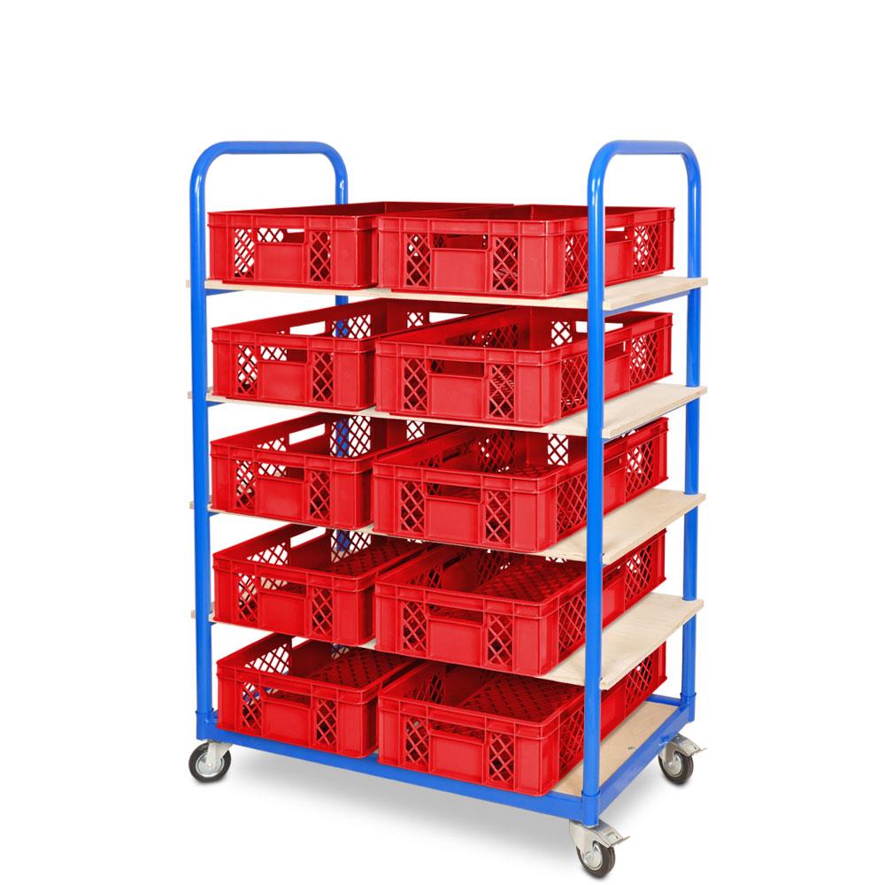 Etagenwagen mit 5 Ebenen, BxTxH 1050x500x1450 mm, 4 Lenkrollen, 2 Rollen mit Feststellbremse, bestückt mit 10 Euroboxen BxTxH 600x400x150 mm, durchbrochen, mit Durchfassgriffen
