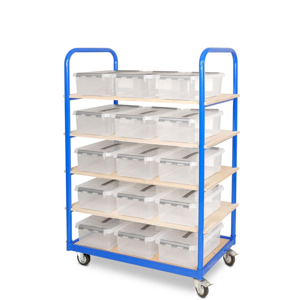 "Etagenwagen mit 5 Ebenen, BxTxH 1050x500x1450 mm, 2 Lenk- (mit Feststellbremse) u. 2 Bockrollen, bestückt mit 15 Clipboxen je 12 Liter"