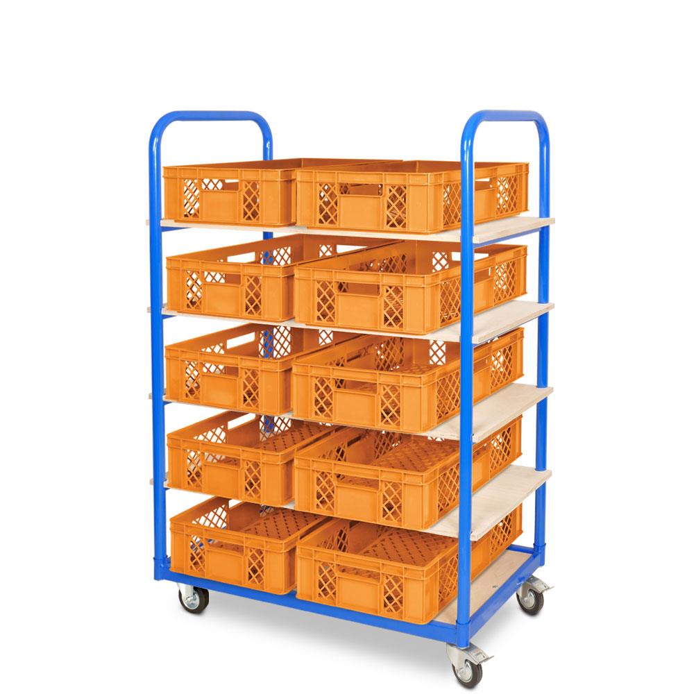 Etagenwagen mit 5 Ebenen, BxTxH 1050x500x1450 mm, 2 Lenk- (mit Feststellbremse) u. 2 Bockrollen, bestückt mit 10 Euroboxen BxTxH 600x400x150 mm, durchbrochen, mit Durchfassgriffen