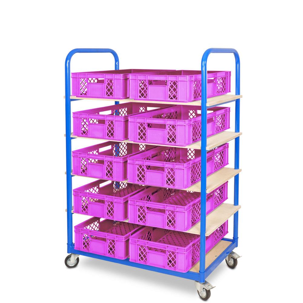 Etagenwagen mit 5 Ebenen, BxTxH 1050x500x1450 mm, 4 Lenkrollen, 2 Rollen mit Feststellbremse, bestückt mit 10 Euroboxen BxTxH 600x400x150 mm, durchbrochen, mit Durchfassgriffen