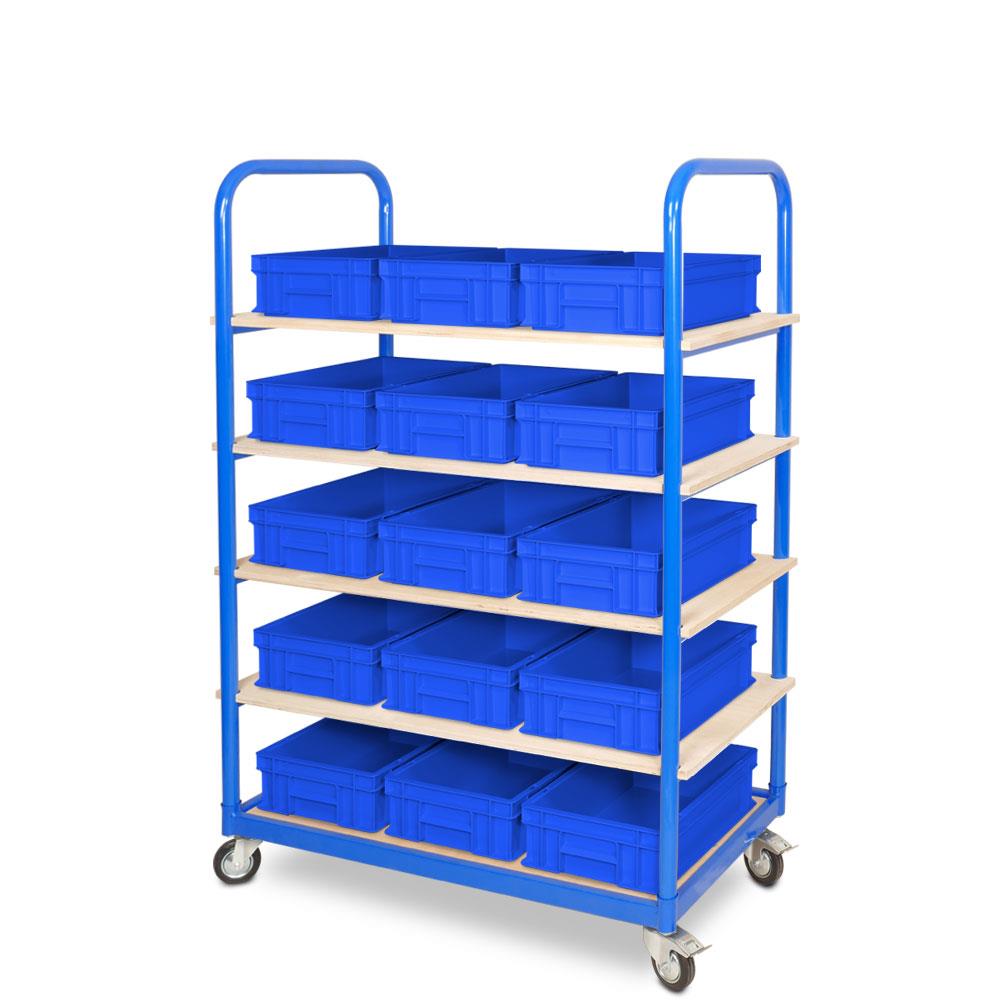 Etagenwagen mit 5 Ebenen, BxTxH 1050x500x1450 mm, 4 Lenkrollen, 2 Rollen mit Feststellbremse, bestückt mit 15 Euroboxen BxTxH 400x300x120 mm, mit Griffleisten