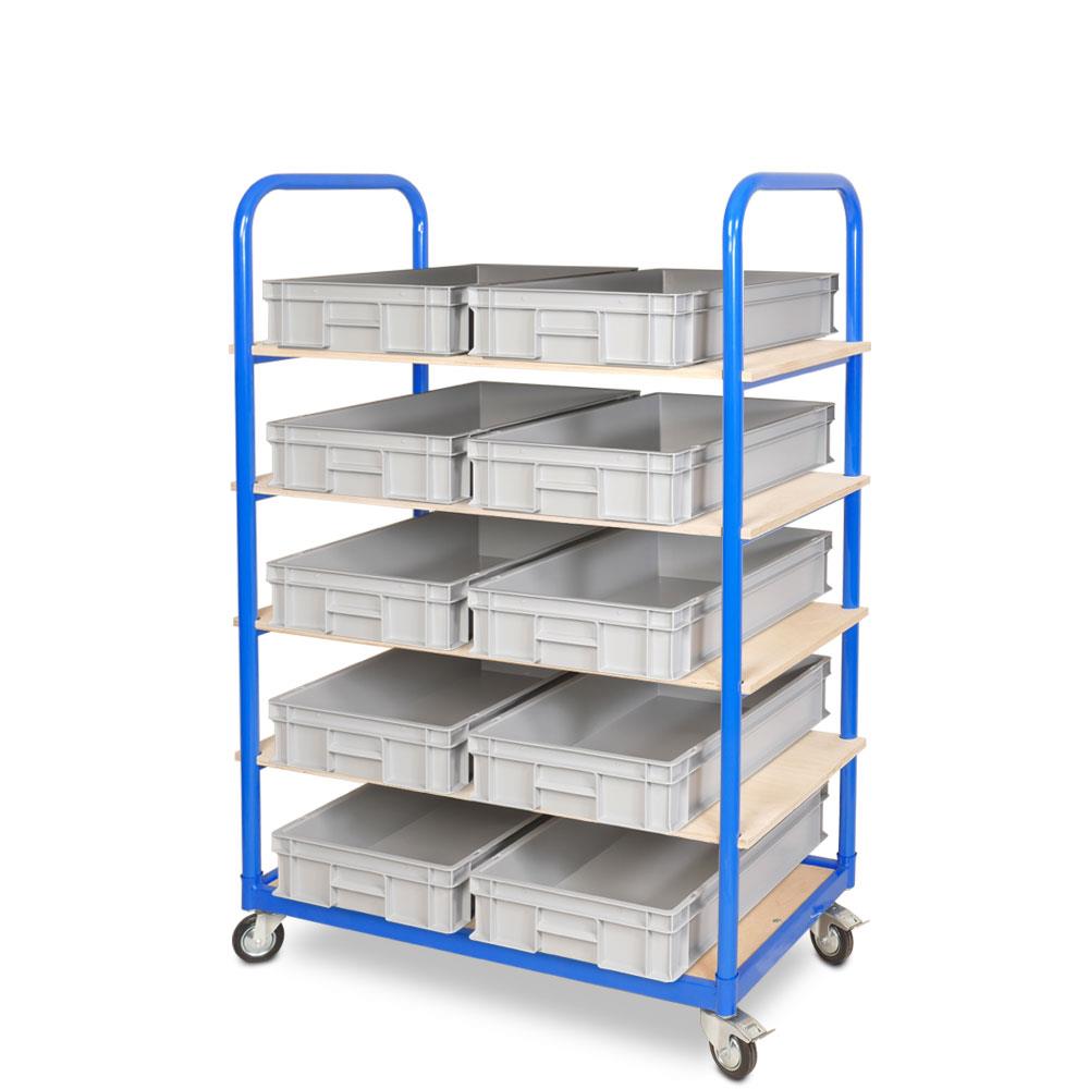 Etagenwagen mit 5 Ebenen, BxTxH 1050x500x1450 mm, 4 Lenkrollen, 2 Rollen mit Feststellbremse, bestückt mit 10 Euroboxen BxTxH 600x400x120 mm, mit Griffleisten