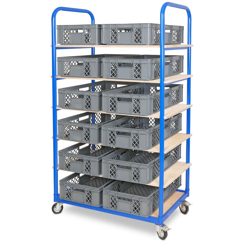 Etagenwagen mit 6 Ebenen, BxTxH 1050x500x1690 mm, 4 Lenkrollen, 2 Rollen mit Feststellbremse, bestückt mit 12 Euroboxen BxTxH 600x400x150 mm, durchbrochen, mit Durchfassgriffen