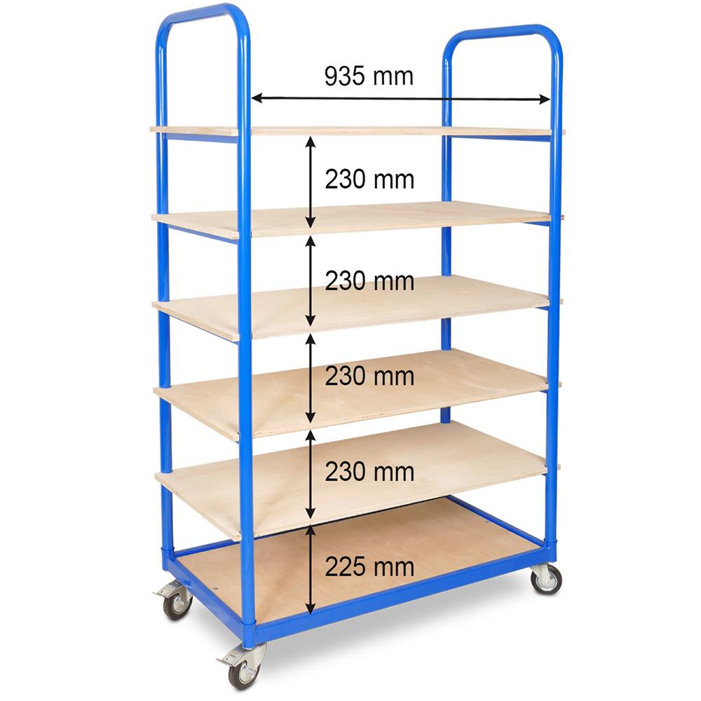 Der Kommissionierwagen verfügt über 6 Ebenen mit robusten, 15 mm starken und naturbelassenen Schichtholzladeflächen. Die geschweißte Stahlrohr- und Profilstahlkonstruktion ist hochwertig in der Farbe blau RAL 5010 kunststoffbeschichtet und schützt dadurch die Oberflächen vor den alltäglichen Belastungen des Betriebsalltags. Der Kommissionier- und Transportwagen hat 4 Lenkrollen mit leise laufenden Gummiräder, die eine einfache und sichere Handhabung ermöglichen. 2 Feststellbremsen gewährleisten auch im beladenen Zustand und Bodenneigungen einen sicheren Stand.