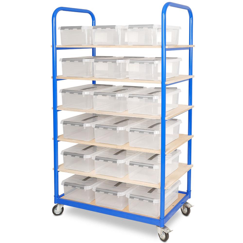 Etagenwagen mit 6 Ebenen, BxTxH 1050x500x1690 mm, 4 Lenkrollen, 2 Rollen mit Feststellbremse, bestückt mit 18 Clipboxen je 12 Liter