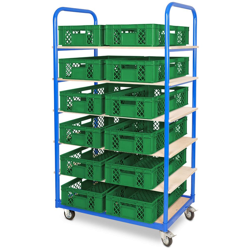 Etagenwagen mit 6 Ebenen, BxTxH 1050x500x1690 mm, 2 Lenk- (mit Feststellbremse) u. 2 Bockrollen, bestückt mit 12 Euroboxen BxTxH 600x400x150 mm, durchbrochen, mit Durchfassgriffen