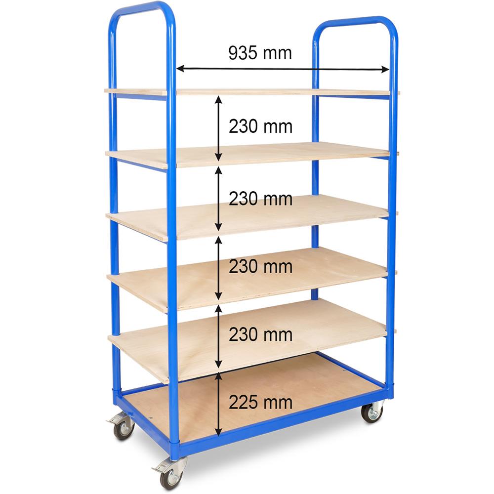Der Kommissionierwagen verfügt über 6 Ebenen mit robusten, 15 mm starken und naturbelassenen Schichtholzladeflächen. Die geschweißte Stahlrohr- und Profilstahlkonstruktion ist hochwertig in der Farbe blau RAL 5010 kunststoffbeschichtet und schützt dadurch die Oberflächen vor den alltäglichen Belastungen des Betriebsalltags. Der Kommissionier- und Transportwagen hat 2 Lenkrollen und 2 Bockrollen mit leise laufenden Gummiräder, die eine einfache und sichere Handhabung ermöglichen. 2 Feststellbremsen gewährleisten auch im beladenen Zustand und Bodenneigungen einen sicheren Stand.