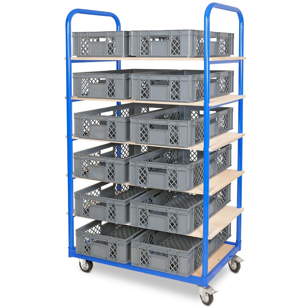 Etagenwagen mit 6 Ebenen, BxTxH 1050x500x1690 mm, 2 Lenk- (mit Feststellbremse) u. 2 Bockrollen, bestückt mit 12 Euroboxen BxTxH 600x400x150 mm, durchbrochen, mit Durchfassgriffen