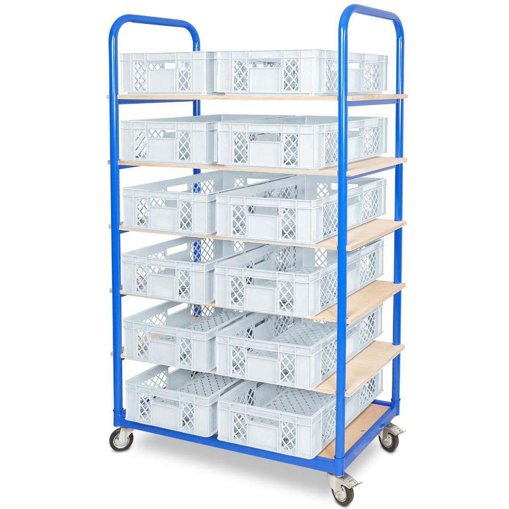 Etagenwagen mit 6 Ebenen, BxTxH 1050x500x1690 mm, 4 Lenkrollen, 2 Rollen mit Feststellbremse, bestückt mit 12 Euroboxen BxTxH 600x400x150 mm, durchbrochen, mit Durchfassgriffen