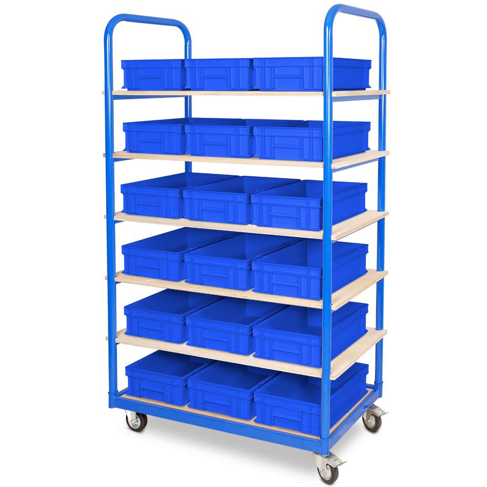 Etagenwagen mit 6 Ebenen, BxTxH 1050x500x1690 mm, 2 Lenk- (mit Feststellbremse) u. 2 Bockrollen, bestückt mit 18 Euroboxen, BxTxH 400x300x120 mm, mit Griffleisten