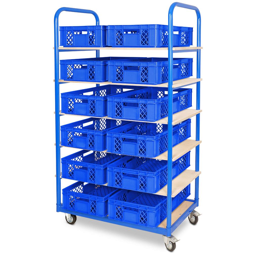Etagenwagen mit 6 Ebenen, BxTxH 1050x500x1690 mm, 2 Lenk- (mit Feststellbremse) u. 2 Bockrollen, bestückt mit 12 Euroboxen BxTxH 600x400x150 mm, durchbrochen, mit Durchfassgriffen