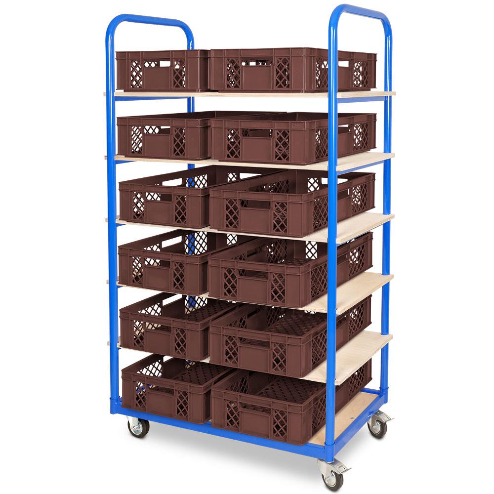 Etagenwagen mit 6 Ebenen, BxTxH 1050x500x1690 mm, 2 Lenk- (mit Feststellbremse) u. 2 Bockrollen, bestückt mit 12 Euroboxen BxTxH 600x400x150 mm, durchbrochen, mit Durchfassgriffen