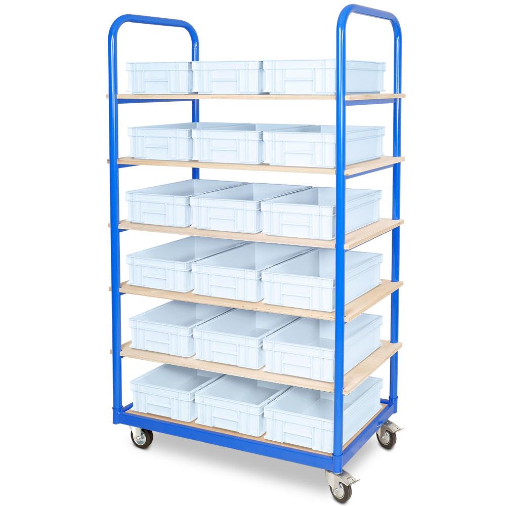Etagenwagen mit 6 Ebenen, BxTxH 1050x500x1690 mm, 2 Lenk- (mit Feststellbremse) u. 2 Bockrollen, bestückt mit 18 Euroboxen BxTxH 400x300x120 mm, mit Griffleisten