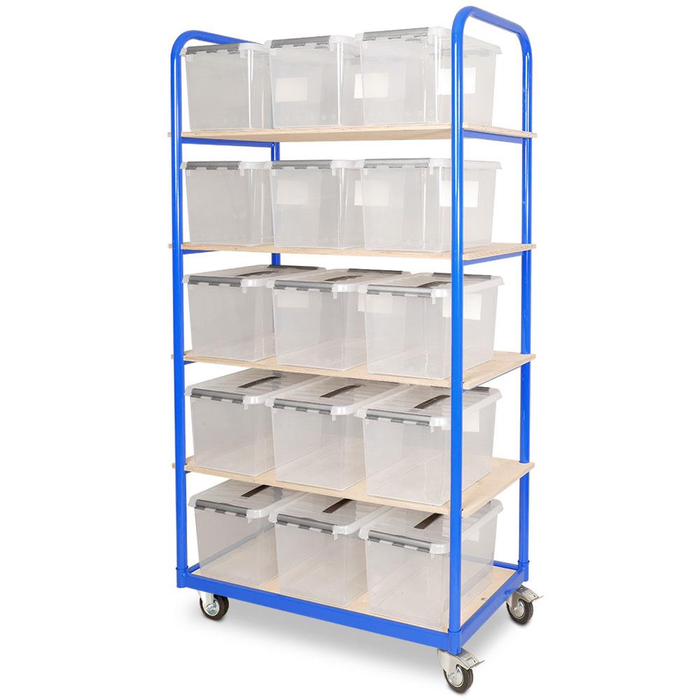 Etagenwagen mit 5 Ebenen BxTxH 1050x500x1880 mm, 2 Lenk- (mit Feststellbremse) u. 2 Bockrollen, bestückt mit 15 Clipboxen je 22 Liter