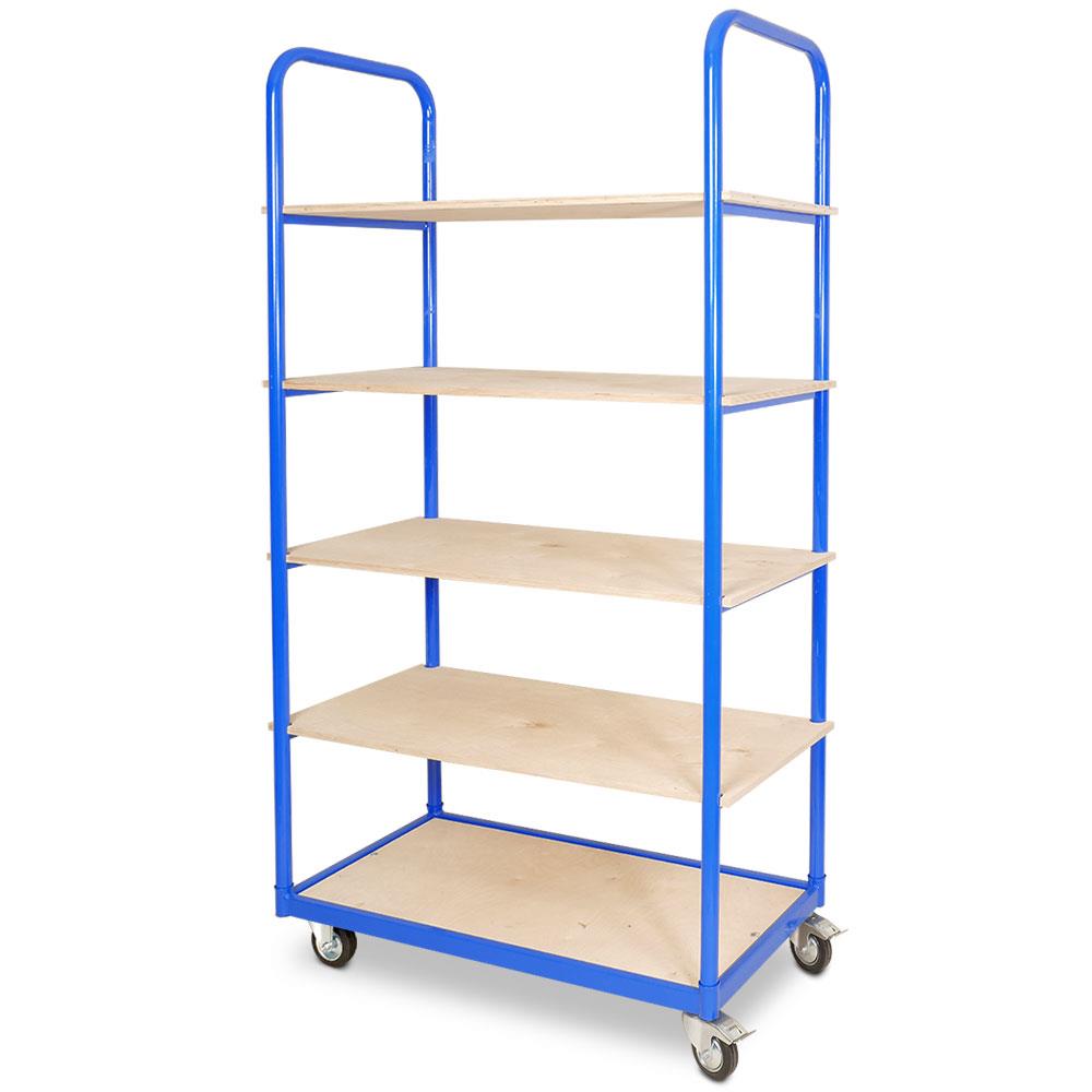Der Kommissionierwagen verfügt über 5 Ebenen mit robusten, 15 mm starken und naturbelassenen Schichtholzladeflächen. Die geschweißte Stahlrohr- und Profilstahlkonstruktion ist hochwertig in der Farbe blau RAL 5010 kunststoffbeschichtet und schützt dadurch die Oberflächen vor den alltäglichen Belastungen des Betriebsalltags. Der Kommissionier- und Transportwagen hat 2 Lenkrollen und 2 Bockrollen mit leise laufenden Gummiräder, die eine einfache und sichere Handhabung ermöglichen. 2 Feststellbremsen gewährleisten auch im beladenen Zustand und Bodenneigungen einen sicheren Stand.