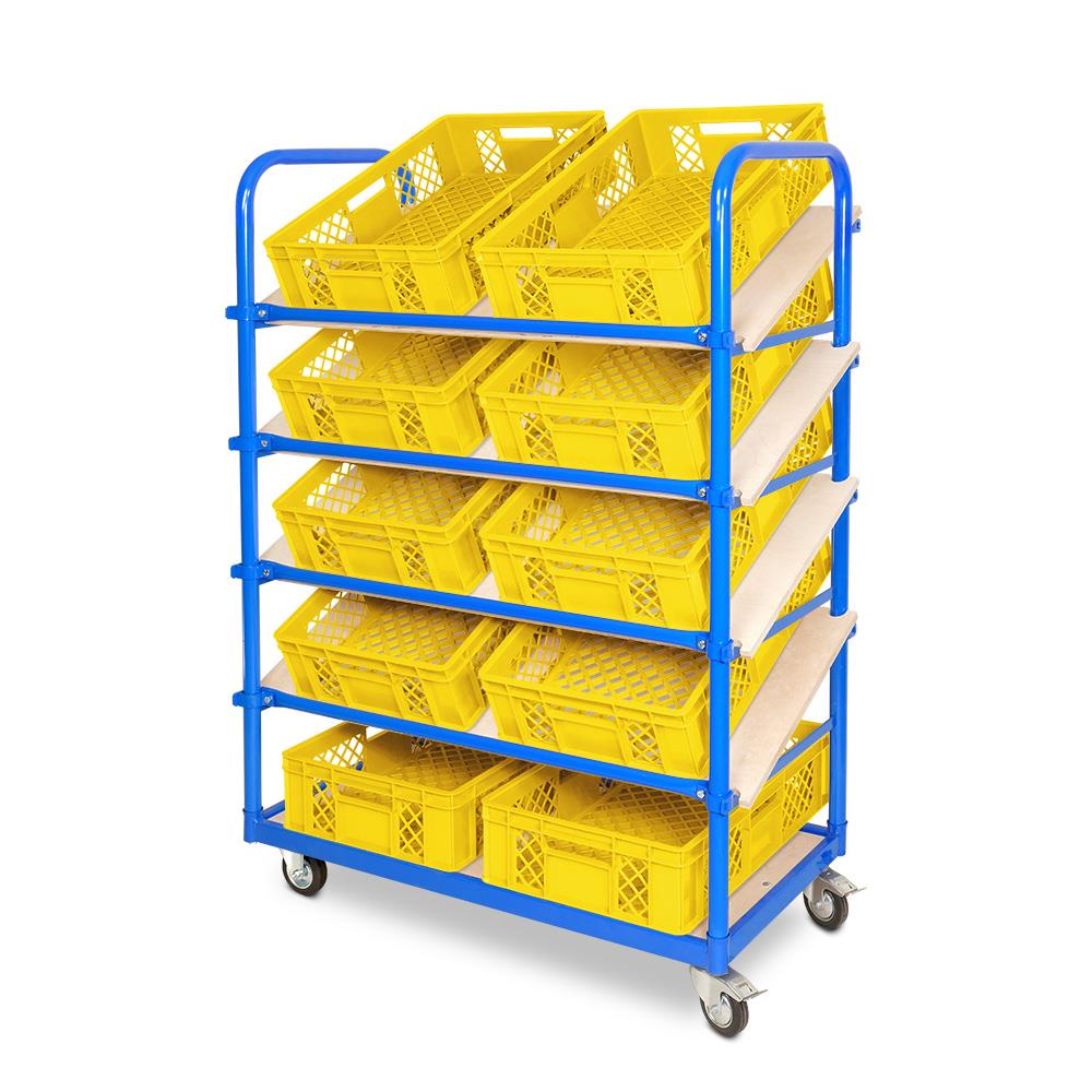 Dieser Schrägbodenregalwagen ist das ideale Transportmittel in Industriebereichen und für die Kommissionierung im Lager, wie auch für die Materialbereitstellung in der Montage bestens geeignet.