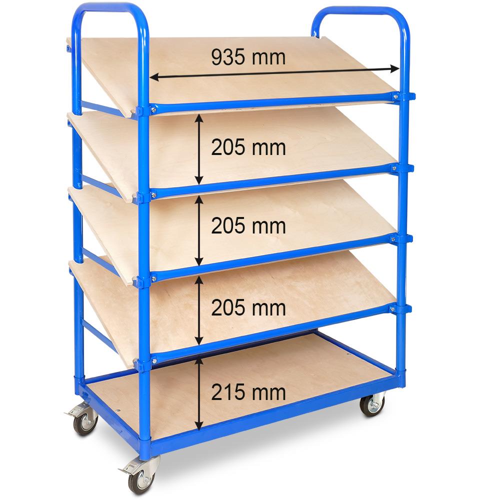 Der Kommissionierwagen verfügt über 5 Ebenen mit robusten, 15 mm starken und naturbelassenen Schichtholzladeflächen. Die geschweißte Stahlrohr- und Profilstahlkonstruktion ist hochwertig in der Farbe blau RAL 5010 kunststoffbeschichtet und schützt dadurch die Oberflächen vor den alltäglichen Belastungen des Betriebsalltags. Der Kommissionier- und Transportwagen hat 2 Lenkrollen und 2 Bockrollen mit leise laufenden Gummiräder, die eine einfache und sichere Handhabung ermöglichen. 2 Feststellbremsen gewährleisten auch im beladenen Zustand und Bodenneigungen einen sicheren Stand.