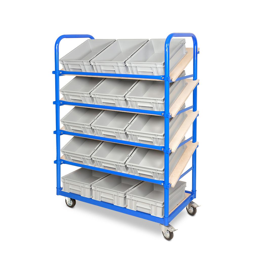Dieser Schrägbodenregalwagen ist das ideale Transportmittel in Industriebereichen und für die Kommissionierung im Lager, wie auch für die Materialbereitstellung in der Montage bestens geeignet.
