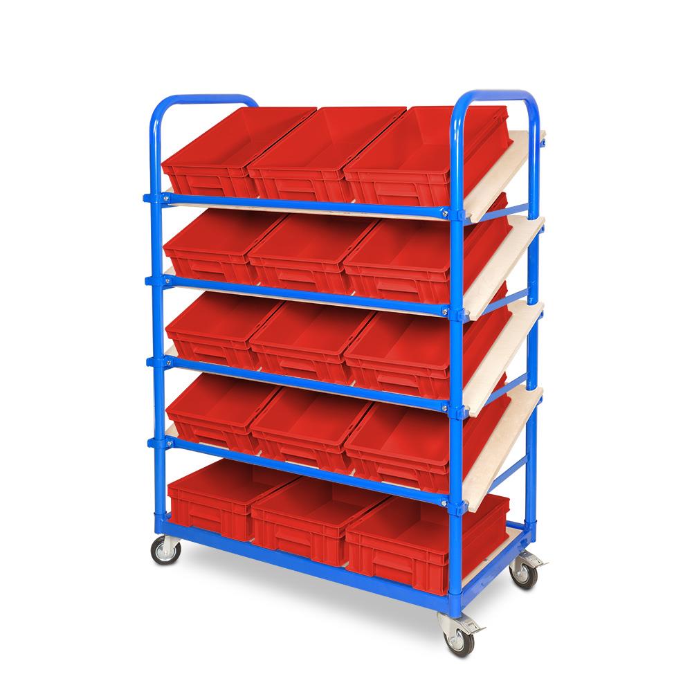 Dieser Schrägbodenregalwagen ist das ideale Transportmittel in Industriebereichen und für die Kommissionierung im Lager, wie auch für die Materialbereitstellung in der Montage bestens geeignet.