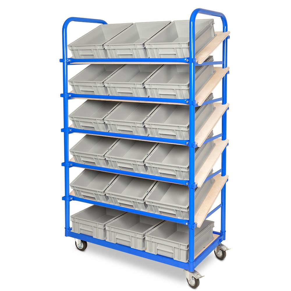 "Schrägboden-Regalwagen mit 6 Ebenen, BxTxH 1050x500x1690 mm, 2 Lenk- (mit Feststellbremse) u. 2 Bockrollen, bestückt mit 18 Euroboxen BxTxH 400x300x120 mm, mit Griffleisten"