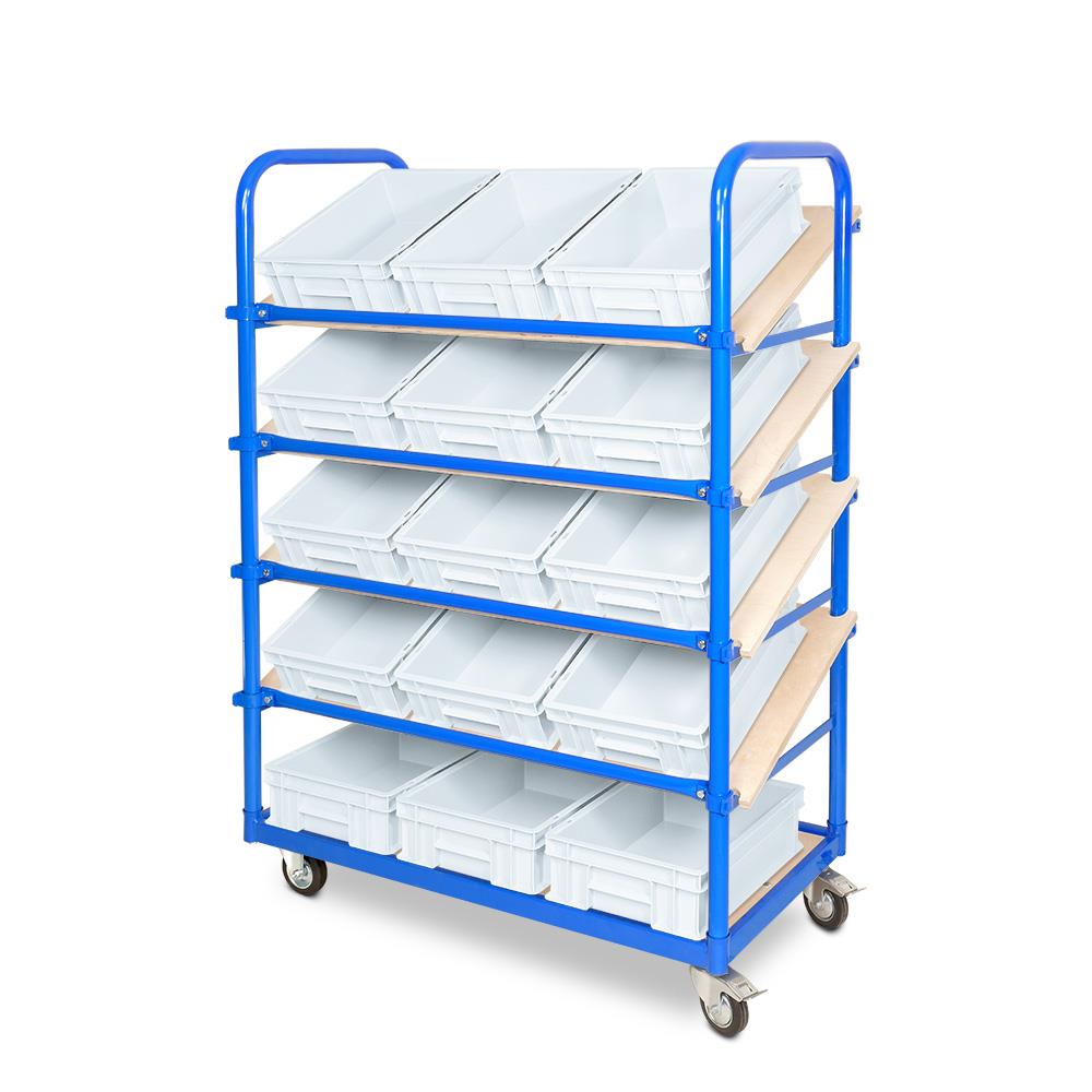 Dieser Schrägbodenregalwagen ist das ideale Transportmittel in Industriebereichen und für die Kommissionierung im Lager, wie auch für die Materialbereitstellung in der Montage bestens geeignet.