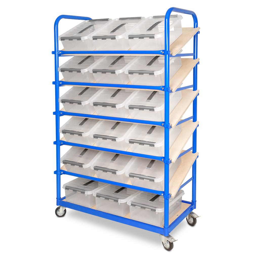 "Schrägboden-Regalwagen mit 6 Ebenen, BxTxH 1050x500x1690 mm, 4 Lenkrollen, 2 Rollen mit Feststellbremse, bestückt mit 18 Clipboxen je 12 Liter"